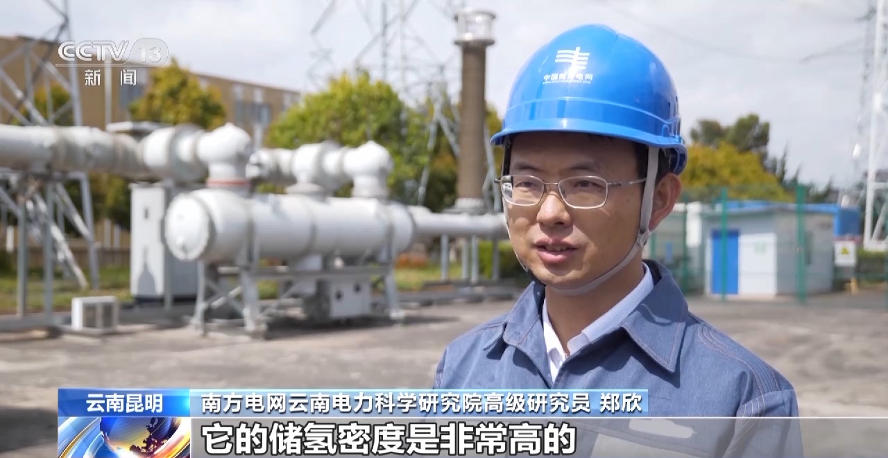 南方电网云南电力科学研究院高级研究员郑欣说:“能够储存200立方米的氢气,它的储氢密度是非常高的,如果换成普通的常用的三个兆帕的储氢罐,体积要增加20倍,可能这样储存的氢气就要占满这样大半个场地的储罐。”