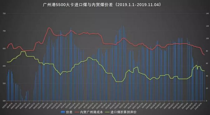 对此,找煤网煤炭分析师王闯指出,政策管控方面,现在有部分海关收紧的情况,力度不大, 管控出手的时间太晚了。价差方面,近期内贸加速下跌,以广州港为例,5500K进口内贸煤理论价差在逐渐缩小,从十月初的100元左右价差缩小到目前在40-50元左右,但依然较大。