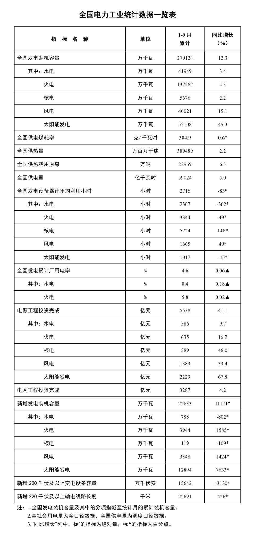 10月23日,国家能源局发布1-9月份全国电力工业统计数据。