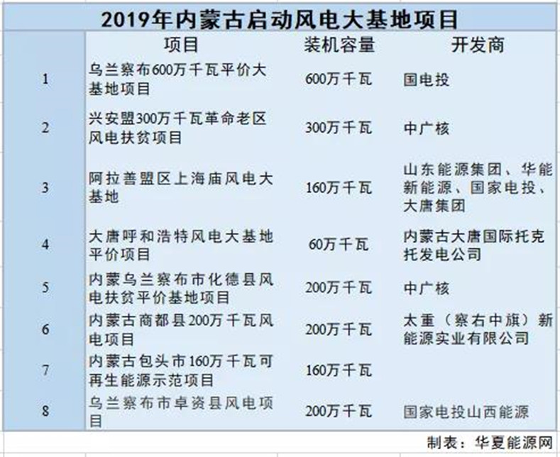 5月10日,中广核新能源内蒙古兴安盟3GW平价风电项目获得核准;8月,上海庙至山东直流特高压输电通道配套可再生能源基地阿拉善盟区域1600MW风电项目发布公告;8月15日,大唐与和林格尔县人民政府再签60万千瓦风电基地建设项目;9月5日,中广核宣布将在内蒙古化德县建设200万千瓦风电平价基地项目,总投资170亿……