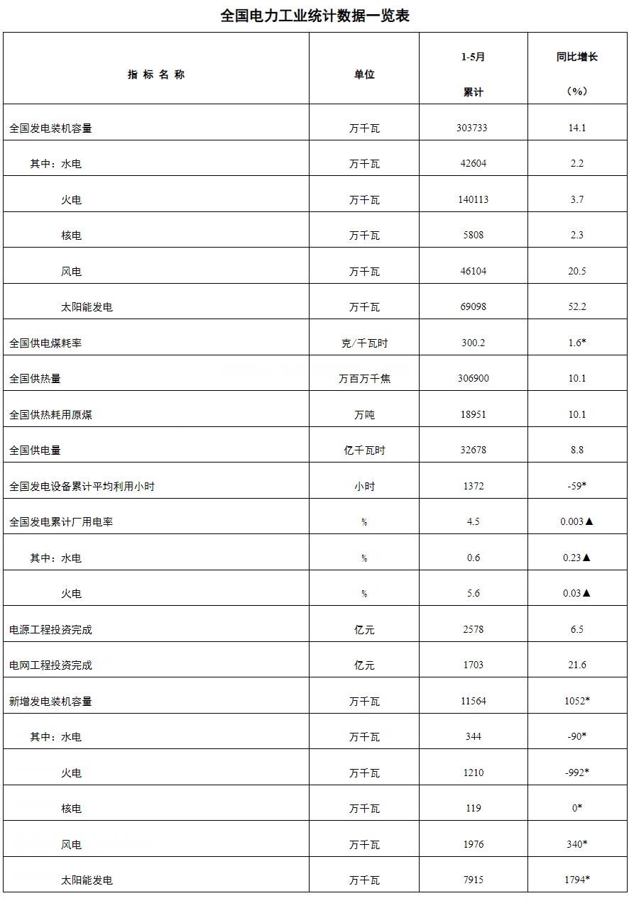 6月28日,国家能源局发布1-5月份全国电力工业统计数据。