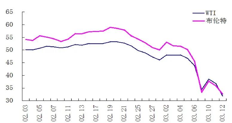 国际油价在3月9日闪崩后加速下行,截至3月12日,布伦特及WTI原油期货价格分别收于33.22美元/桶和31.5美元/桶,较月初下跌36%和32%。