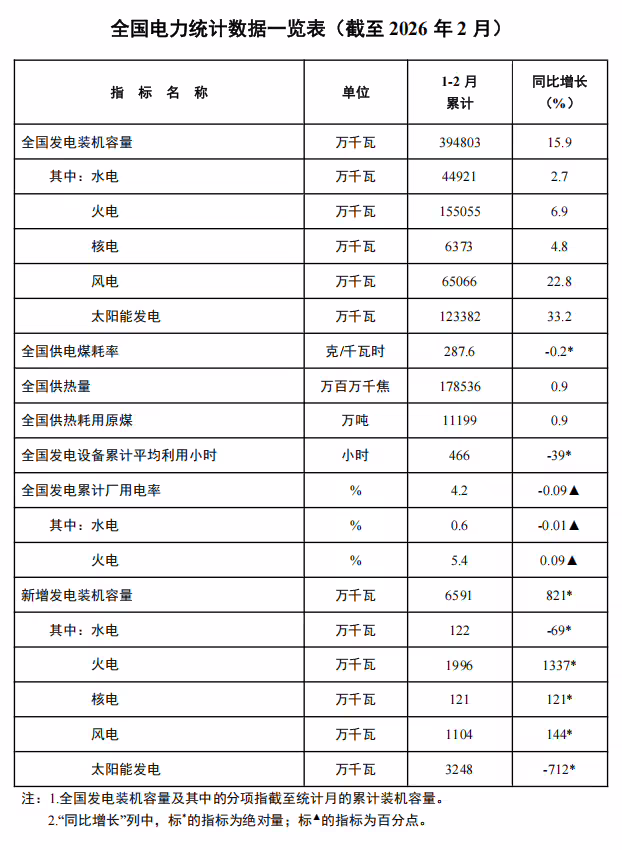 今天下午,国家能源局发布 2026 年1—2月份全国电力统计数据。