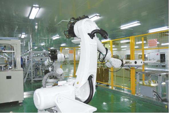 生产线上机械手臂组装高倍聚能光伏电板。