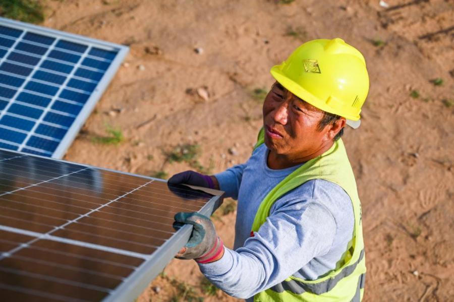新华社照片,鄂尔多斯(内蒙古),2021年7月13日 内蒙古伊金霍洛旗:采煤沉陷区建设光伏项目 7月13日,工人为天骄绿能50万千瓦光伏发电项目安装光伏板。 位于内蒙古伊金霍洛旗乌兰木伦镇的天骄绿能50万千瓦光伏发电项目是采煤沉陷区生态治理光伏发电的示范项目,项目占地面积约4.2万亩。目前,项目建设进入收尾阶段,预计年内并网发电。 新华社记者 刘磊 摄