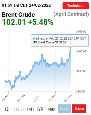 受此影响,伦敦布伦特原油期货价格24日盘中突破每桶100美元,为7年多来首次破百。纽约商品交易所4月交货的轻质原油期货价格升至每桶95.54美元。