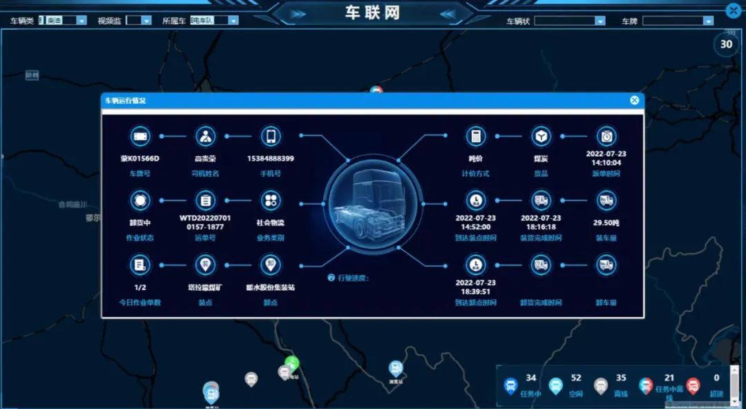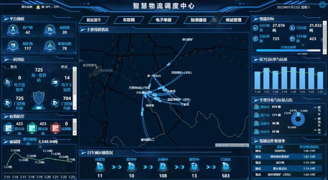 依托伊金霍洛旗工业经济数字调度平台,开发建成集新能源车辆及司乘人员信息归集、在途轨迹全程监控等功能为一体的物流调度平台,全力打造新型智慧公路港。