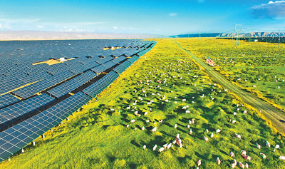 青海省海南藏族自治州,绵延数百平方公里的塔拉滩生态光伏发电园区里,深蓝色的“光伏海洋”蔚为壮观,光伏板下牧草茂盛,绿意盎然。
