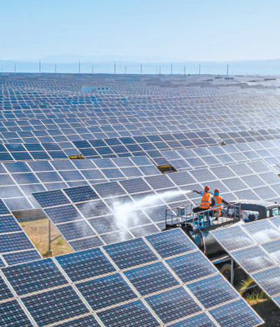 光伏产业园区内,工人在清洗光伏板。