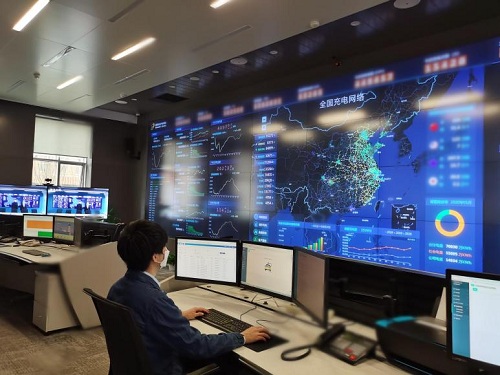 国家电网公司员工通过智慧车联网平台监测充电桩运营情况。