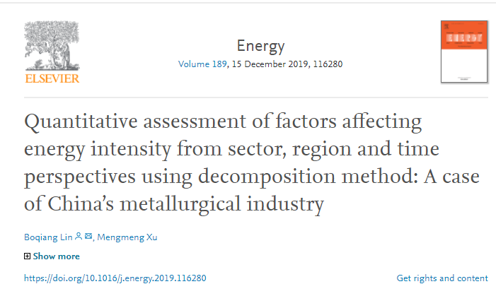 题目:基于分解法从部门、区域和时间角度定量评估影响能源强度的因素:以中国冶金工业为例(Quantitative assessment of factors affecting energy intensity from sector, region and time perspectives using decomposition method: A case of China’s metallurgical industry)