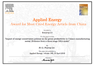 一篇是“Impact of energy conservation policies on green productivity in China’s manufacturing sector: Evidence from a three stage DEA model”,来自Applied Energy。Applied Energy是为能源转换、节约和能源电力资源的最优管理和利用等领域提供信息和思想的期刊,其2017年的影响因子为7.182。