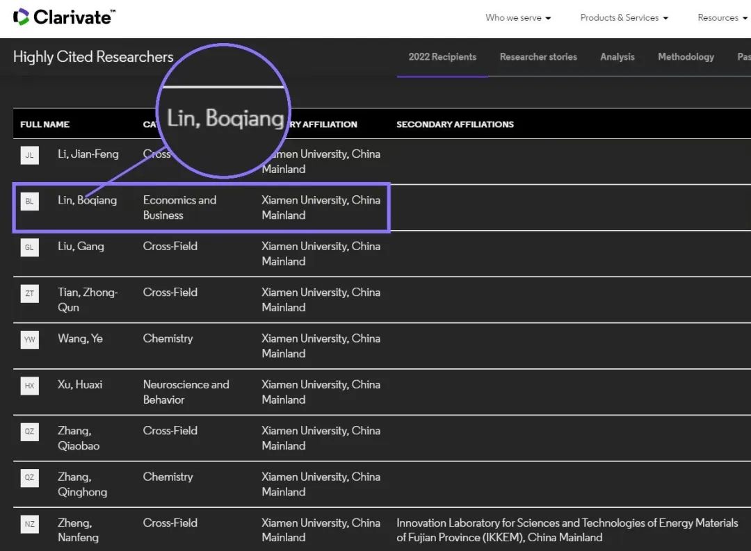 2022年11月,权威引用数据分析机构科睿唯安(Clarivate Analytics)公布了2022年度高被引科学家(Highly Cited Researcher)名单。厦门大学管理学院中国能源政策研究院院长、能源经济与能源政策协同创新主任林伯强教授入选经济与商业(Economics and Business)领域高被引科学家,这也是林伯强教授连续第四年入选名单。据悉,今年的名单是根据2011年1月至2021年12月的11年期间所发表的高被引论文数量遴选得出,这些论文的被引频次在 Web of Science 中位于同学科、同发表年份的前1%。此次全球共有6938位科学家入选名单,中国内地排名第二,共有1169人次入选,其中经济与商业领域仅有3位中国内地学者入选。厦门大学(包括马来西亚分校)此次共有10位学者入选,林伯强教授是唯一一位文科机构入选学者。